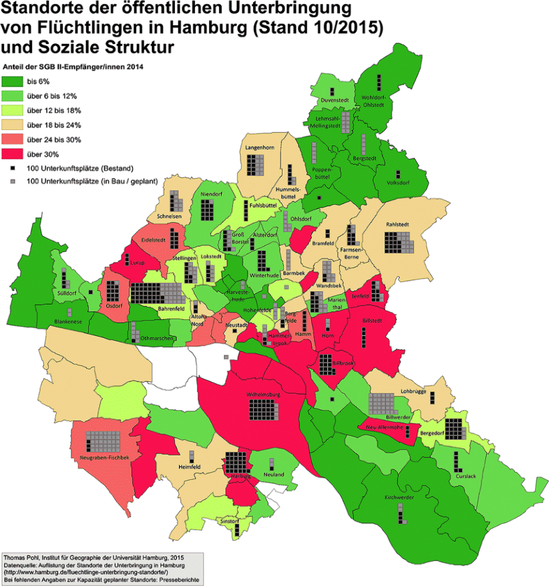 Bestehende und geplante Unterkünfte für Flüchtlinge und sozialräumliche Struktur in Hamburg 2015