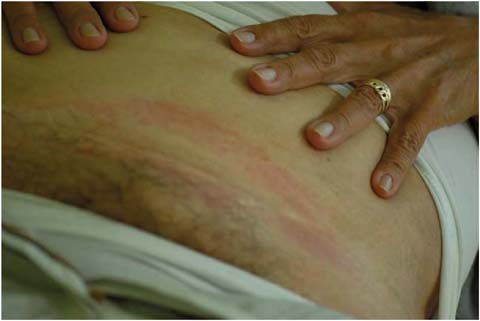 Initial zeigen sich in den Hautfalten, insbesondere submammär und inguinal flächige Erytheme, die abhängig von der Entzündungsaktivität blass oder auch feuerrot imponieren können (Abb. 13.1 und 13.2). Im weiteren Verlauf sind erosive Umwandlungen möglich. Die sekundäre Besiedelung der Intertrigo ist häufig. Für eine Candidabesiedelung sprechen die typischen Satellitenpapeln und -pusteln, die sich im Randbereich der Intertrigoherde manifestieren. Insbesondere bei initialen Läsionen kann Juckreiz fehlen, der in Abhängigkeit von der Entzündungsaktivität sehr ausgeprägt sein kann. Insbesondere nässende Hautveränderungen kennzeichnen auch brennende Missempfindungen.