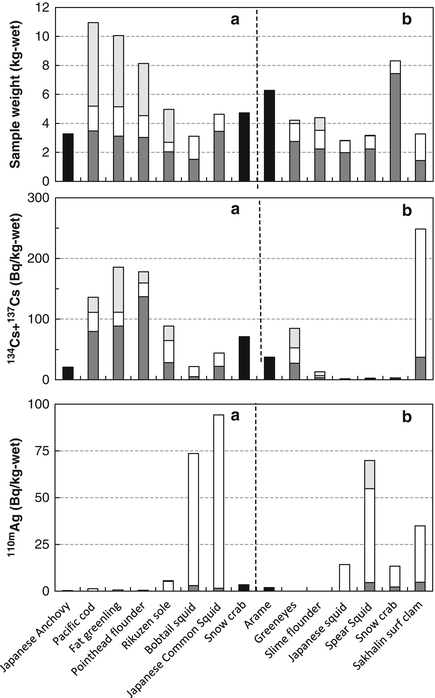 Comparison of weight and radioactivity in each part of the marine organisms. Black bars, whole body; gray bars, muscle (edible parts); open bars, viscera; light gray bars, bony parts. Samples were collected in June (a) and December (b), 2011