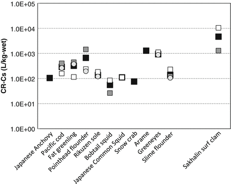 Concentration ratio of cesium (CR-Cs) in each part of the marine organisms. Black squares, whole body; gray squares, muscle (edible parts); open squares, viscera; open circles, bony parts