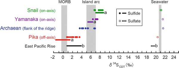 Compilation of sulfur isotopic ratios (δ34SCDT‰) of sulfides and sulfates from the Southern Mariana Trough compared with those from mid-ocean ridge and island arc settings. MORB: Sakai et al. (1984); Island arc volcanic rock: Ueda and Sakai (1984); Seawater: Rees et al. (1978). a: Kakegawa et al. (2008); b: Styrt et al. (1981) and Kerridge et al. (1983)