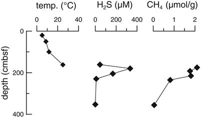Vertical profiles of borehole temperature, H2S concentration in pore fluid, and CH4 content in sediment, at Station BMS-I-4 in the Iheya North Knoll field. Units in the figure are abbreviated as follows; cmbsf cm below the seafloor, μM μmol/L. The unit of μmol/g for head space gas (CH4) indicates 1 μmol of gas specie was extracted from 1 g of sediment in wet base
