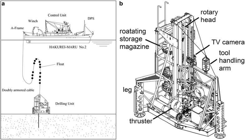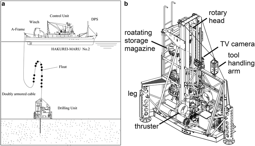 (a) Operation scheme of BMS (Benthic Multicoring System). (b) Illustrated configuration of BMS (modified after Marumo et al. 2008)