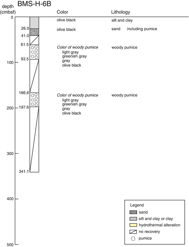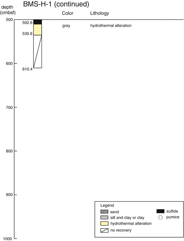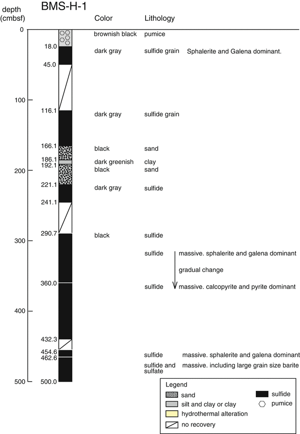 In the BMS-H-1 core, sulfide minerals were abundantly identified in several layers. Massive sulfides occupied from 0 to 20 cmbsf. Sulfidic grits were found below 223 cmbsf, underlain by barite and sphalerite mixed layer. Sphalerite was dominant among sulfide minerals in the layer from 339 to 370 cmbsf, whereas chalcopyrite was dominant from 370 to 417 cmbsf. Below 417 cmbsf to the core catcher depth (530 cmbsf), barite was dominant again. The BMS-H-6B core mainly consisted of unaltered sediment including woody pumice.