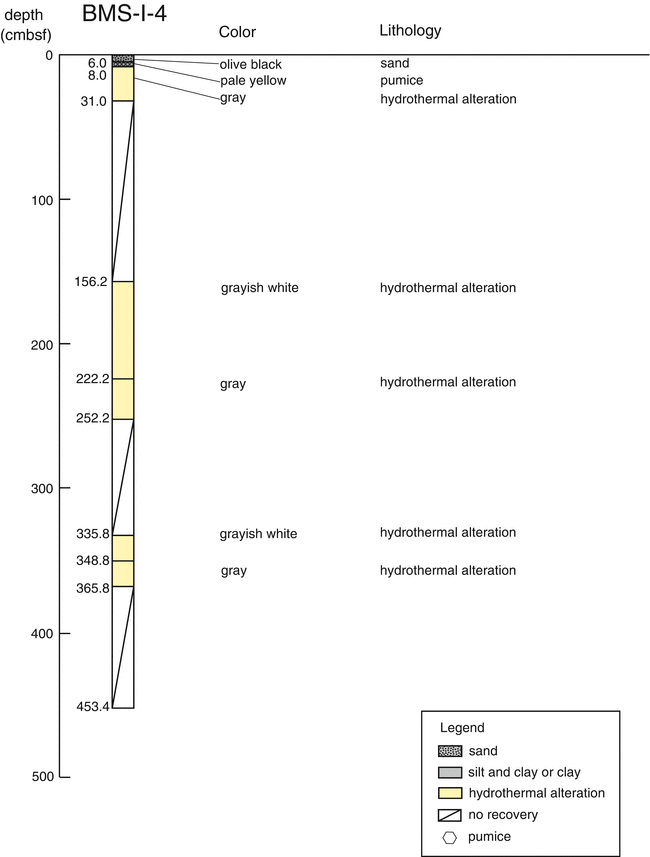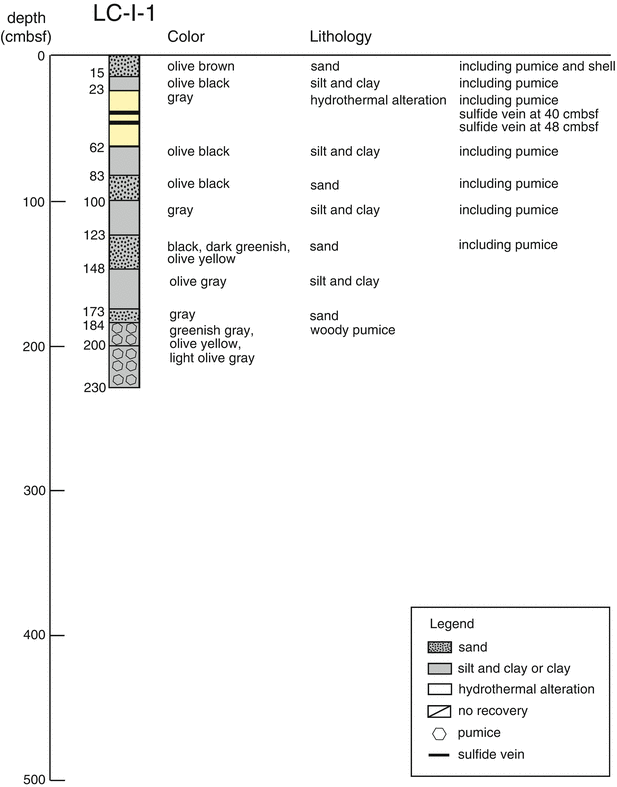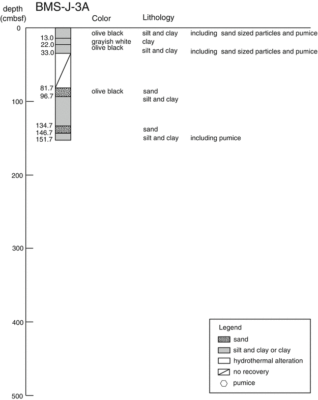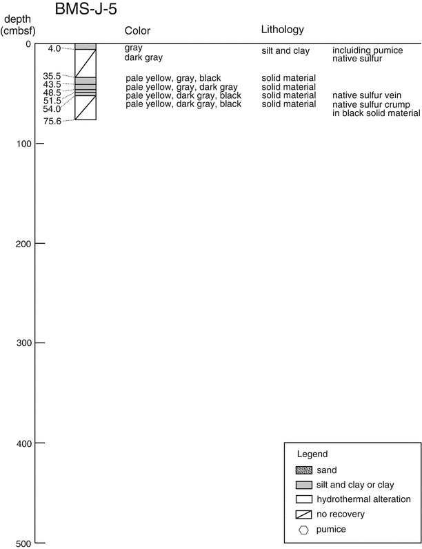 In the BMS-I-4 core, evidence for hydrothermal alteration was notable in most entire part. Core of only 30 cm length was recovered during the first coring, and pyrite and clay minerals were found in it. Below 170 cmbsf, the obtained core was dominated by grayish white colored mud mostly consisted of kaolinite, which was continuous to the core catcher depth (370 cmbsf). Together with the observation of white-colored slime-like fluid during the drilling operation, this intensely altered sediment layer was considered to have at least 2 m thickness. During sub-sampling onboard, gas bubbling from the sediment was observed, as well as detection of H2S smell. The LC-I-1 core was characterized by silt and clay sediment which often included pumiceous material. Below 184 cmbsf, large size woody pumices were abundant. It is notable to recognize hydrothermally altered mud dominated from 23 to 62 cmbsf, which included sulfide veins at 40 and 48 cmbsf.