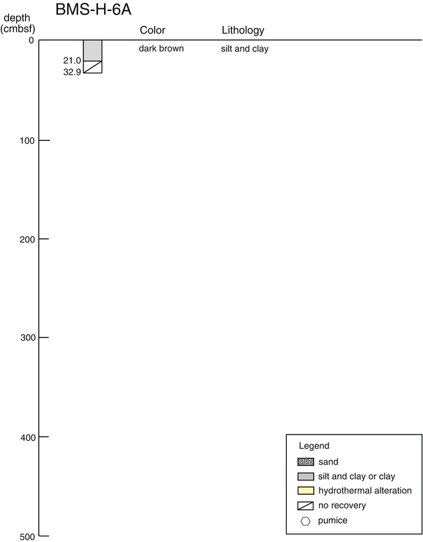 In the Hakurei field in the Izena Hole, three BMS operations were conducted in Stations BMS-H-1, BMS-H-6A and BMS-H-6B (Fig. 42.2b). Station BMS-H-1 was located at about 100 m west from a large sulfide mound which was recognized as the most prominent hydrothermal mound in the northern part of the Hakurei field. This area has been explored intensively by JOGMEC (Japan Oil, Gas and MEetals National Corporation) under a framework of the ocean energy and mineral resources development program. With visual observation by the monitoring camera, seafloor was recognized as covered with sediment including gravels of a few cm diameters, associated with white patches. Drilling at Station BMS-H-1 successfully attained to 610 cmbsf (centimeters below the seafloor). Station BMS-H-6 was located at about 150 m northeast from the large sulfide mound. Drilling at Station BMS-H-6 was ceased due to a trouble in a rotary jaw when drilled to 33 cmbsf (BMS-H-6A). Drilling was re-started after the repair at the same station (BMS-H-6B). However, due to limited time for operation, the drilling attained only to 341 cmbsf and its core recovery was not good.