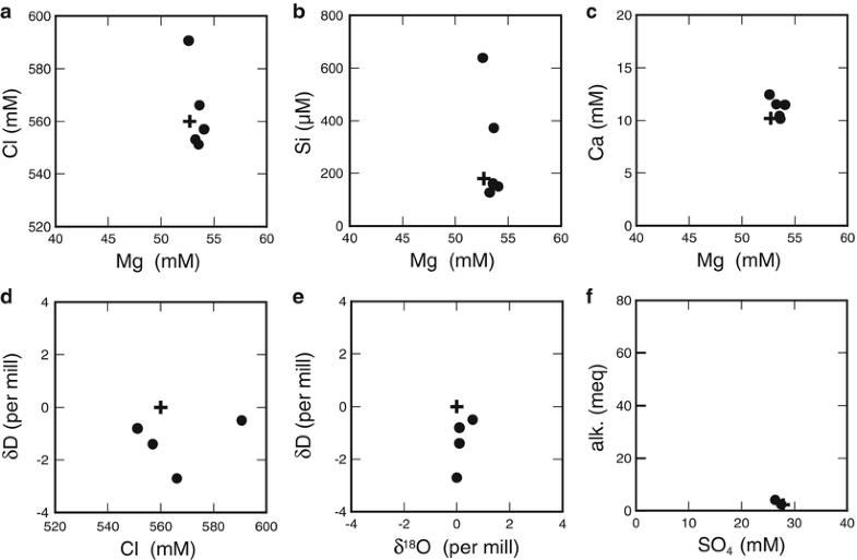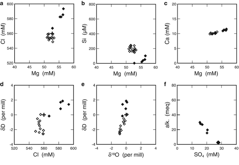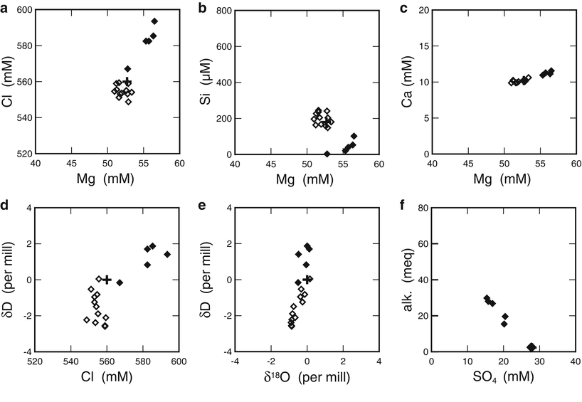 Two components diagrams for pore fluid samples collected from the Jade field: (a) Cl vs Mg, (b) Si vs Mg, (c) Ca vs Mg, (d) δD vs Cl, (e) δD vs δ18O, and (f) alkalinity vs SO4. Symbols and unit abbreviations are same as in Fig. 42.6