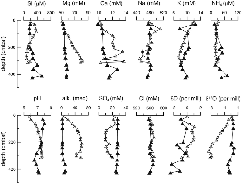 Results of chemical analysis of pore fluid samples are summarized in Table S1 in the supplementary file. In this table, δD and δ18O values are expressed in per mill with SMOW and δ34S values are expressed in per mill with CDT.