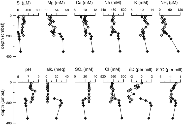 Vertical profiles of pore fluid chemistry in the Iheya North Knoll field; closed diamonds represent Station BMS-I-4 and open diamonds represent Station LC-I-1. Units in the figure are abbreviated as follows; cmbsf cm below the seafloor, mM mmol/L, meq meq/L, μM μmol/L