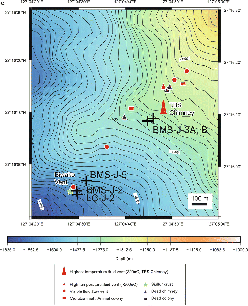 Bathymetric maps of studied hydrothermal fields. Coring stations were superimposed on the maps. (a) Locality of the studied hydrothermal fields in the mid-Okinawa Trough. (b) Hakurei field in the Izena Hole. (c) Jade field in the Izena Hole. (d) Iheya North Knoll field