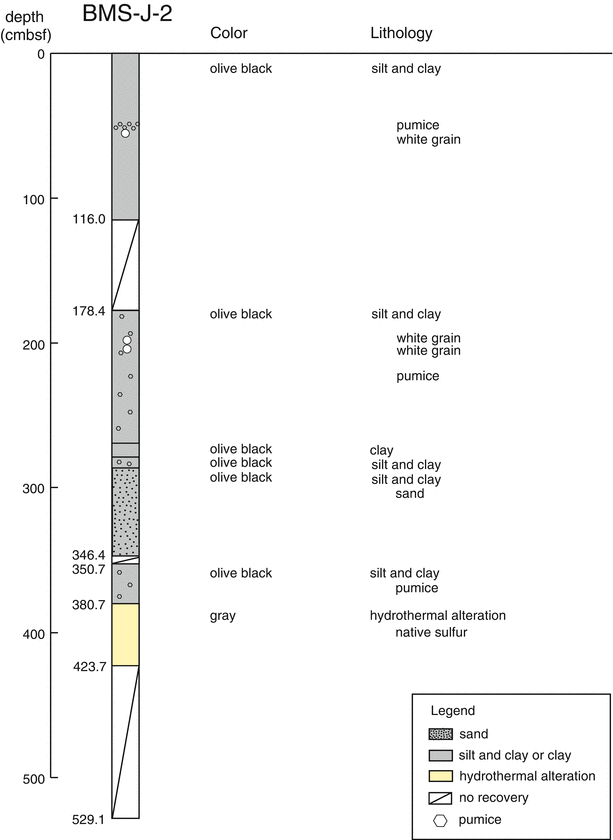 Most part of the BMS-J-2 core (shallower than 381 cmbsf) was characterized by pumiceous sediment, and spotty white colored grains were noted in some layers. Below 381 cmbsf, the core consisted of hydrothermal mud including abundant clay minerals, which was continuous to the core catcher depth (423 cmbsf). In this layer, occurrence of pyrite and native sulfur was recognized. The BMS-J-3A core was characterized by sediment consisted of pumice, silt, sand and white-colored clay minerals and the BMS-J-3B core showed similar signature. In the BMS-J-5 core, gravels of native sulfur were observed, which plugged the bottom of the corer. In the LC-J-2 core, hydrothermally altered pumice was recognized occasionally in olive brown colored silt and clay sediment. Plant debris was notable in the layer from 100 to 200 cmbsf. Below 300 cmbsf, the core consisted of grayish white colored hydrothermal mud, which was continuous to the core catcher depth (320 cmbsf). During sub-sampling onboard, gas bubbling from the sediment was observed.