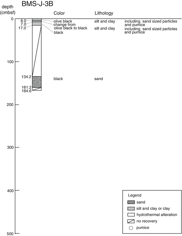 In the Jade field in the Izena Hole, four BMS operations were conducted at Stations BMS-J-2, BMS-J-3A, BMS-J-3B and BMS-J-5 (Fig. 42.2c). Station BMS-J-2 was located near the Biwako vent site where consolidated sediment with native sulfur was observed. With visual observation by the monitoring camera, seafloor was recognized as covered with large size of consolidated sediment blocks. After the drilling attained to 529 cmbsf, this hole was cased using two casing pipes. Station BMS-J-3 was located in the central area of the Jade field where high temperature fluid venting congregate around the TBS chimney. In this area, gravels of native sulfur were recovered by surface coring (Yokoyama et al., Chap. 31). Due to steep slope topography, the coring operation was limited to pushing the bit without rotation. The first trial attained to 151 cmbsf (BMS-J-3A) and the second trial attained to 164 cmbsf by rotating the bit slowly (BMS-J-3B). During the drillings, emanation of black-colored slime-like fluid from the seafloor about one meter apart from the drilled hole was observed. This hole was cased after the drilling. Station BMS-J-5 was located near the site of liquid CO2 bubble emanation, which was reported by Sakai et al. (1990). Several trials were required to deploy the BMS on the seafloor in stable condition. Only a short core (30–40 cm) was recovered due to plugging of the bit. In addition to the BMS operations, one LC core sampling was conducted at Station LC-J-2 located in the vicinity of the BMS-J-2.