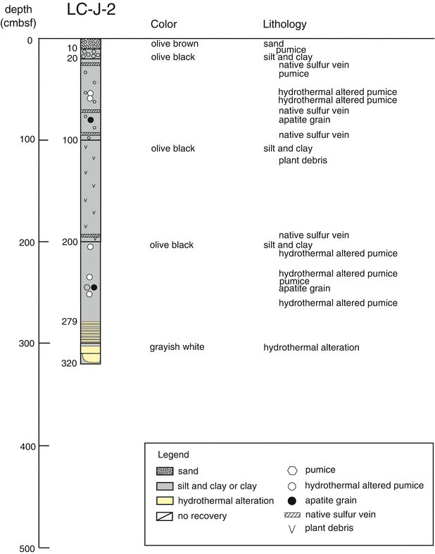 Contrary to these, pore fluid collected from the LC-J-2 core showed large shift in concentration of several chemical species (open triangles in Fig. 42.6). Decrease in SO4 coupled with increase in alkalinity suggests significant sulfate reduction reaction within the sediment. Sulfur isotopic composition of SO4 showed 34S-eiriched signature up to +50 ‰ (Table S1), which supports the sulfate reduction reaction. Molar ratio between the sulfate decrease to the alkalinity increase is estimated as 2 or higher (Fig. 42.7f), which suggests the sulfate reduction utilizes organic matter as reductant. This interpretation is in accordance with that the maximum of these shifts are recognized around the depths from 100 to 200 cmbsf where abundant plant debris was found during the visual observation. Occurrence of pyrite and native sulfur was identified by the mineralogical study (Miyoshi et al., Chap. 44), which implies these sulfur species are product of the sulfate reduction. On the other hand, profiles for other species are recognized as basically monotonous linear trend, which were characterized as increase toward deep in Mg and Ca concentrations, and as decrease in Na and K concentrations. Similar linear trends are also recognized in δD and δ18O values, which suggests that pore fluid chemistry at Station LC-J-2 was controlled by mixing process between two components due to elemental diffusion. This interpretation would be in accordance with the result of the visual observation, which discriminated intense grayish white colored hydrothermally altered mud below 300 cmbsf and spotty evidence for hydrothermal alteration in the shallower sediment. If this is the case, the endmember in the deeper layer would be characterized as significant enrichment in Mg and Ca, and depletion in K. This signature cannot be explained by a result of involvement of the hydrothermal component, but could be attributed to formation and/or dissolution of alteration minerals. The mineralogical study revealed occurrence of dolomite and magnesite in the layer from 280 to 320 cmbsf (Miyoshi et al., Chap. 44). Significant increase in Mg, Ca and also excess alkalinity would be explained by dissolution of these carbonate minerals, although it is unknown what triggered the dissolution. The mineralogical study also identified euhedral crystals of K-feldspar in the layer from 300 to 320 cmbsf (Miyoshi et al., Chap. 44). If substantial amount of K-feldspar forms, it would explain depletion in K in the pore fluid.