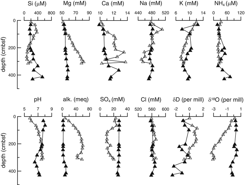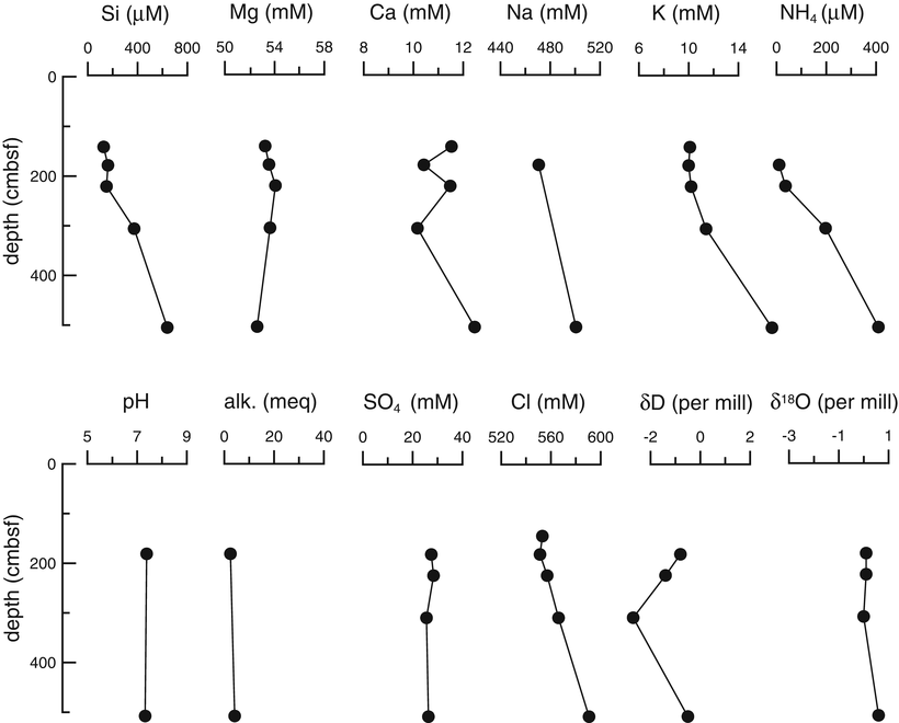 Pore fluid chemistry at Station LC-I-1 showed basically no significant deviation from that of seawater (open diamonds in Fig. 42.8). On the other hand, correlated shift between δD and δ18O values is clearly recognized (Fig. 42.9). It is difficult to discuss which type of fluid interactions affects pore fluid chemistry based on this data set.
