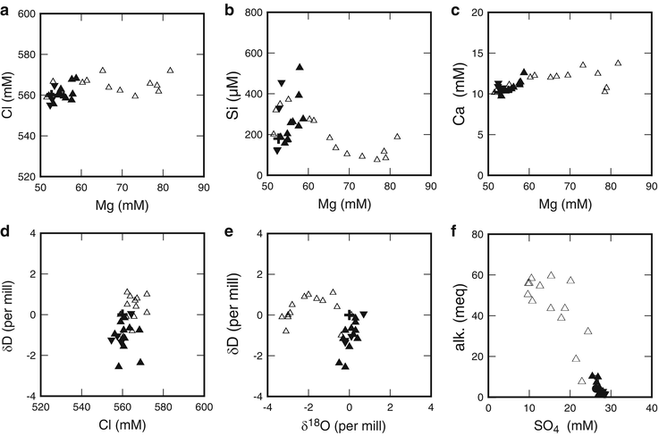 Two components diagrams for the pore fluid samples collected from the Hakurei field: (a) Cl vs Mg, (b) Si vs Mg, (c) Ca vs Mg, (d) δD vs Cl, (e) δD vs δ18O, and (f) alkalinity vs SO4. Symbols and unit abbreviations are same as in Fig. 42.4