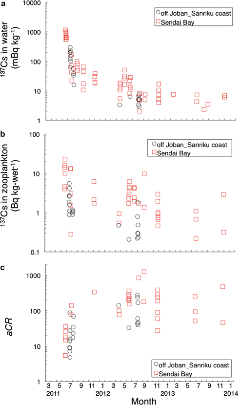 Temporal changes in the concentration of 137Cs in seawater (average value of two or three depth strata) (a) and in zooplankton (b), and the apparent concentration ratio (aCR) for zooplankton (c). Black open circles and red squares indicate data obtained off the Joban–Sanriku coast and in Sendai Bay, respectively (Modified from Kaeriyama et al. 2014)
