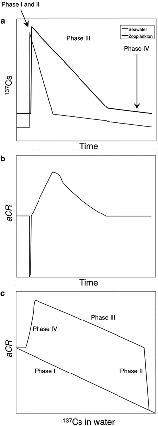 Conceptual temporal variation in 137Cs concentration in seawater (thin lines) and in zooplankton (bold lines) (a), aCR for zooplankton (b), and a scatter plot between 137Cs concentrations in seawater and aCR for zooplankton (c). The temporal variation of 137Cs is defined as the time-course phase from I to IV (Modified from Kaeriyama et al. 2014)