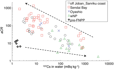 The concentration ratio (CR) (concentration in organisms relative to that in media) under equilibrium conditions is a useful environmental parameter, used in mathematical models to estimate the level of radionuclides present in the organisms in comparison to the surrounding environment such as soil, sediments, water, or air (IAEA 2004; Tagami and Uchida 2013; Howard et al. 2013). The recommended CR values for 137Cs in marine zooplankton, fish, and crustaceans are 40, 100, and 50, respectively (IAEA 2004). In this chapter, we did not calculate CR under equilibrium conditions; therefore, the CR value was referred to as the “apparent CR (aCR)” and was compared to the pre-FNPP CR.