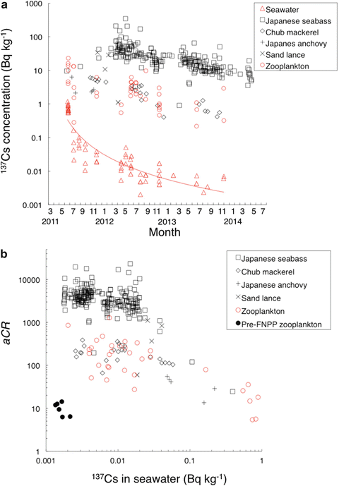 (a) Temporal changes in 137Cs concentrations in seawater (red open triangles), zooplankton (red open circles), sand lance (black crosses), Japanese anchovy (black plus symbols), chub mackerel (black open diamonds), and Japanese sea bass (open squares) in Sendai Bay and off the coast of the Miyagi prefecture (Fisheries Agency 2014). (b) Scatter plots showing the relationship between 137Cs concentration in Sendai Bay seawater and the aCR in zooplankton (red open circles), sand lance (black crosses), Japanese anchovy (black plus symbols), chub mackerel (black open diamonds), and Japanese sea bass (black open squares) in Sendai Bay and off the coast of Miyagi Prefecture. The scatter plot between 137Cs concentration in seawater and the CR for zooplankton off Aomori Prefecture, obtained during October 2005 and June 2006 before the FNPP accident, is also shown as filled circles (data from Kaeriyama et al. 2008a) (Modified from Kaeriyama et al. 2014)