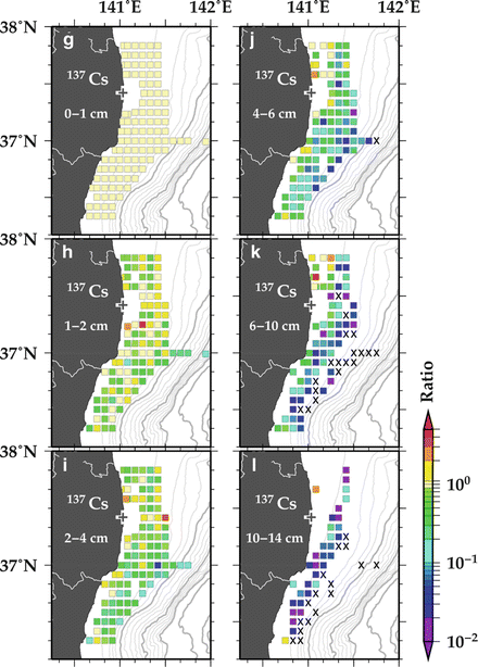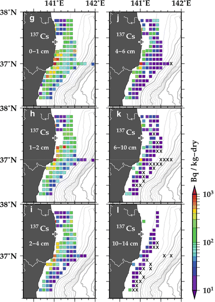 Spatial distributions of 134Cs (a–f) and 137Cs (g–l) concentrations in sediment in July 2012. The respective nuclide and layer are indicated at the upper left side of each map. “X” mean that radiocesium was not detected (concentration was less than the lower limit of detection, which was from 0.63 to 3.0 Bq/kg-dry). Blank tiles mean data missing where no sample was collected. Contour lines indicate water depth at an interval of 100 m. Cross indicates the location of the FNPP