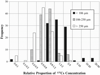 Histograms of relative magnitude of 137Cs concentration in each diameter class of the surface-most sediment compared with the concentration in bulk sediment. Diameter classes are indicated at upper right