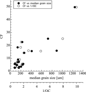 Plot of concentration factor (CF) versus median grain size (solid circles) and 1/organic content (OC) (open circles) for 21 off-Fukushima samples