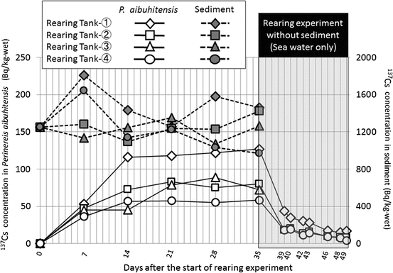 The 137Cs concentrations of P. aibuhitensis reached the maximum value after approximately 2 weeks, and conspicuous fluctuations were not observed during the next 3 weeks. On the 35th day after the start of the experiment, the CR for 137Cs between P. aibuhitensis and sediments (wet/wet) was less than 0.10 (tank 1 = 0.087, tank 2 = 0.056, tank 3 = 0.057, tank 4 = 0.060). Meanwhile, the 137Cs concentrations in P. aibuhitensis varied among the tanks. On the 14th day after the start of the experiment, the 137Cs concentrations in tank 1, tank 2, tank 3, and tank 4 were 116 Bq/kg-wet, 72.5 Bq/kg-wet, 45.1 Bq/kg-wet, and 56.8 Bq/kg-wet, respectively. Four days after separation from the contaminated sediments, the 137Cs concentration in P. aibuhitensis rapidly decreased, to 23–34 % of the concentration on the 35th day. The 137Cs concentration in P. aibuhitensis eventually decreased to less than 20 Bq/kg-wet in all tanks. These results suggest that the 137Cs concentrations in P. aibuhitensis are associated with the sediment contamination level in each tank. We assumed that the observed radiocesium concentration in P. aibuhitensis include measurements of contaminated sediments in their digestive systems.