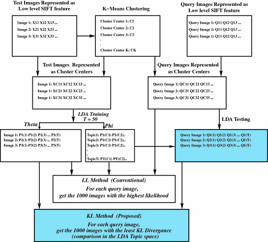 In most of the LDA based systems, the typical approach for retrieval is to compute the likelihood of a query image given the topic distribution of the test images, and return those test images as relevant which give the highest likelihood [1,8]. However, as pointed out in [10] for the information retrieval task, likelihood based systems do not perform well on their own.