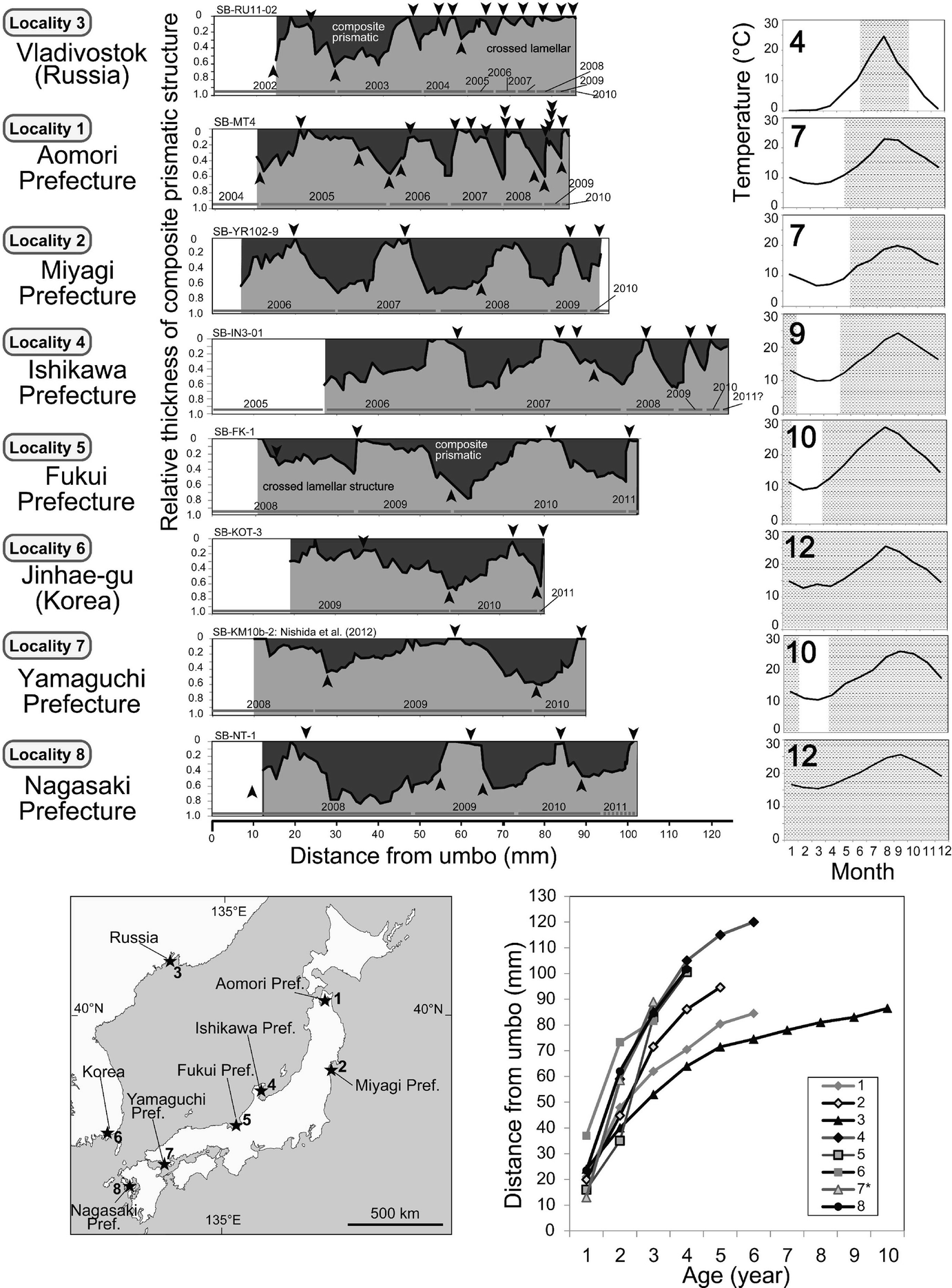 The growth curves and changes in the relative thickness of the two structures in the outer layer at eight localities arranged from north to south along the coasts of Japan, Russia, and Korea. Arrow heads indicate growth breaks; black, gray, and white areas indicate composite prismatic structure, crossed lamellar structure, and missing sections of the outer layer, respectively, and the growth years are indicated by horizontal bars. The water temperature data are from the Japan Oceanographic Data Center (JODC, http://www.data.jma.go.jp/obd/stats/etrn/index.php).Water temperature at each of the eight localities is shown with gray shading on months with water temperature above 12 °C and the number indicating the number of months with water temperature above 12 °C. The growth curve of Locality 7 is for the reference specimen cited from Nishida et al. (2012)