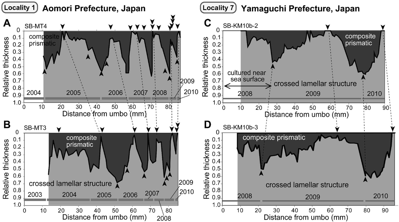 Differences observed in cultivation experiments may also have some effect. Patterns of the relative thickness of the two shell structures were more variable in the specimens from Locality 1, where they were cultured in a net hanging in the water column above the seafloor than in those from Locality 7, where they were cultured in a cage resting on the bottom sediment. Yurimoto et al. (2007) reported a lower monthly shell growth rate in the individuals of Scapharca kagoshimensis cultivated in hanging nets than in those cultivated in cages on the seafloor and attributed this difference to buffeting of the suspended individuals by waves. Thus, the specimens from Locality 7 likely experienced less growth stress than those from Locality 1.