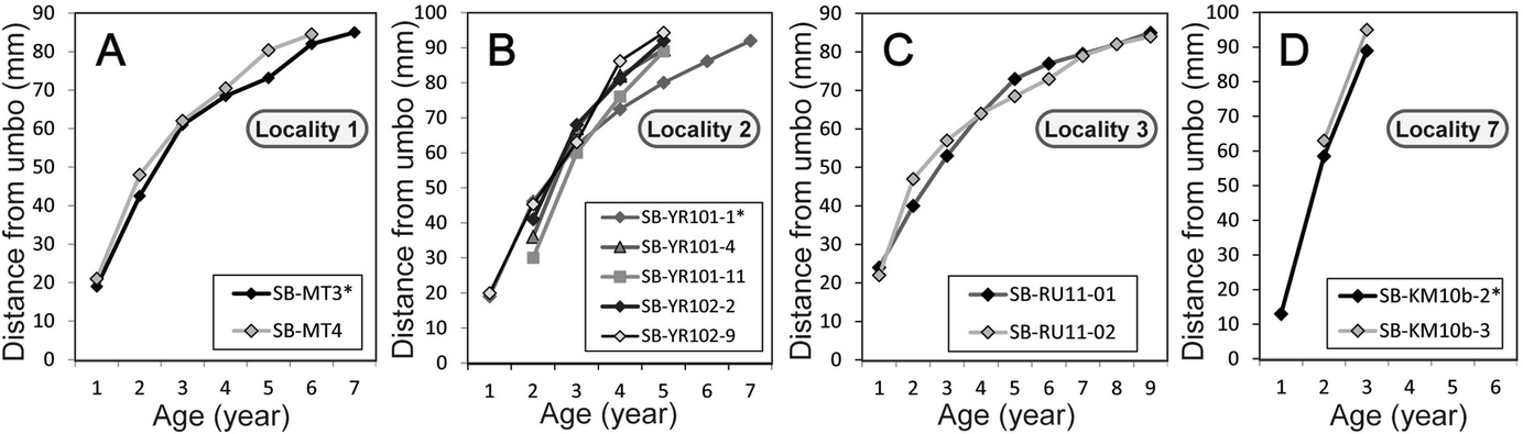 Growth curves of the specimens from Localities 1, 2, 3, and 7 drawn based on the intervals of the summer growth breaks and the positive peaks in the thicknesses of the crossed lamellar structure. Asterisks indicate specimens reported by Nishida et al. (2012); specimens 1, 2a, and 3a in Nishida et al. (2012) are identified as specimens SB-MT3, SB-YU101–1, and SB-KM10b-2, respectively, in this study. (a) Specimens SB-MT3 and SB-MT4 from Locality 1. (b) Specimens SB-YR101–1, SB-YR101–4, SB-YR101–11, SB-YR102–2, and SB-YR102–9 from Locality 2. (c) Specimens SB-RU11–01 and SB-RU11–02 from Locality 3. (d) Specimens SB-KM10b-2 and SB-KM10b-3 from Locality 7