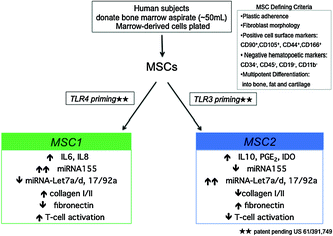 Anti-inflammatory ASC, adipose-derived multipotent stromal or mesenchymal stem cell Bioactive factors BM-MSC, bone marrow-derived multipotent stromal or mesenchymal stem cell Cell-based therapy Chemokines Cytokines Danger or stress responses HSC Hematopoietic stem cells IFN, interferon IL, interleukin Immune modulation or immunomodulating Immune response Immune suppression or immunosuppression MSC, multipotent stromal or mesenchymal stem cell MSC1, pro-inflammatory MSC phenotype MSC2, anti-inflammatory MSC phenotype Pro-inflammatory TLR, Toll-like receptorsAbbreviations