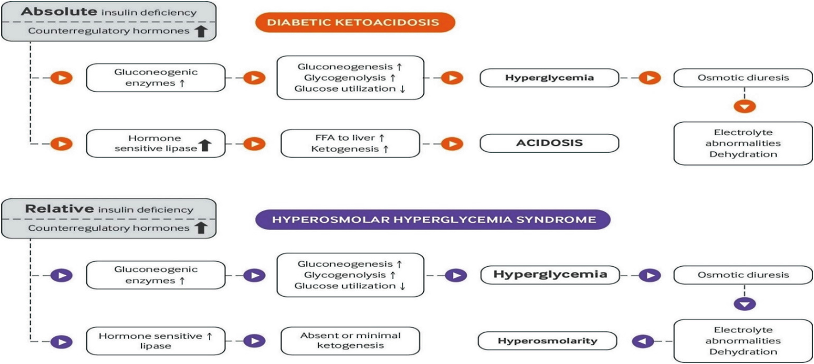 DKA and HHS are two similar yet in many ways different metabolic emergencies of diabetes are encountered in emergency departments. Hyperglycemia, despite being the common ground for both conditions, is different in magnitude for each emergency, being more severe in HHS. Ketoacidosis is the hallmark of DKA found mostly in T1D due to absolute insulin deficiency. In HHS, ketoacidosis is nominal unless a mixed variety, which is due to residual insulin sufficient to prevent ketosis. It was thought that DKA is specific condition for T1D and HHS for T2D but this does not hold anymore. More and more cases of DKA are being reported in T2D and HHS in T1D. Similarly, the characteristic age distribution of acute hyperglycemic emergencies is not valid anymore. It is also not uncommon to find out mixture of two entities presenting in same patient.