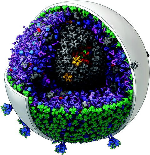 Three-dimensional model of mature HIV. A cutaway view of mature HIV includes the capsid (gray, with pentamers in yellow) and nucleocapsid (red), matrix protein (green), accessory proteins (magenta), membrane (white), and envelope protein (blue). The model was generated using CellPACK by Graham Johnson