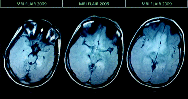 Follow-up MRI after 2 year interval. FLAIR sequences show evolution of the lesion with loss of parenchyma in the right temporal and insular areas