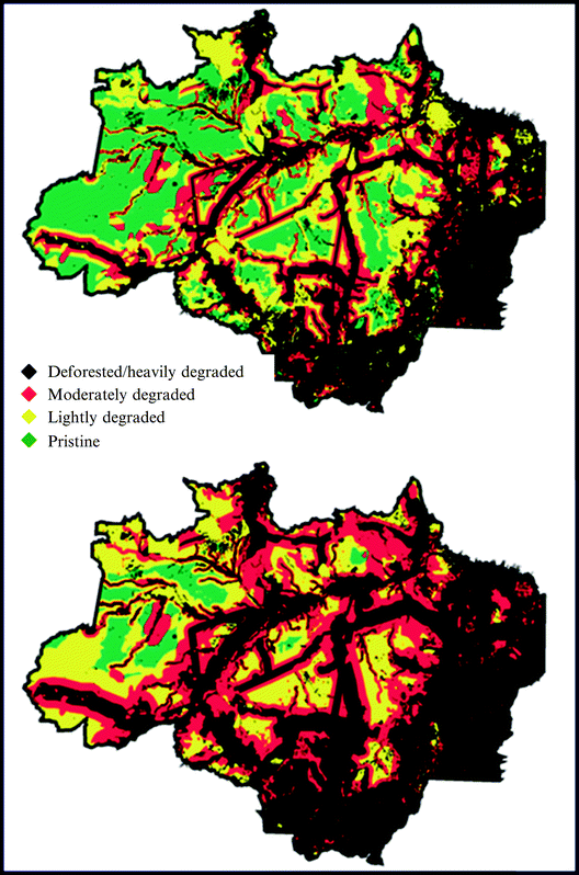 Roads are projected to have a major impact on future patterns of forest loss, fragmentation, and degradation in the Brazilian Amazon. Shown are “optimistic” (above) and “nonoptimistic” (below) scenarios for the region in the year 2020 (From Laurance et al. (2001))