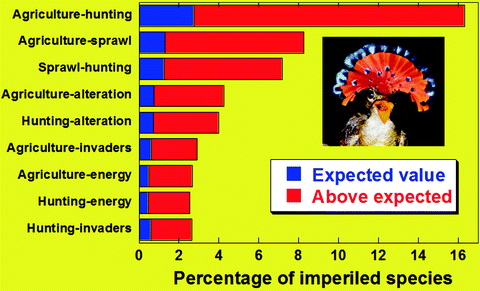 Synergisms are a major driver of species declines. Shown are the expected vs. observed frequencies of mammal species driven to endangerment or extinction by key combinations of environmental threats, using data from the IUCN Red Data Book (Adapted from Laurance and Useche (2009))