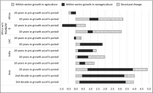 In this chapter, we focus on recent growth accelerations in African and Latin American countries. Therefore, we decided to use a year-by-year calculation using the weights defined in Eq. (9.7) but to calculate each year’s growth rate for the within and between components at sector level across countries as follows: