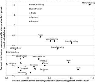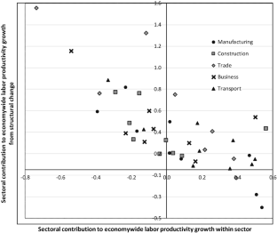 where \( {g}_y^t=\frac{\varDelta {y}^t}{y^{t-1}}, \)\( {g}_{y_i}^t=\frac{\varDelta {y}_i^t}{y_i^{t-1}}, \) and \( {\pi}_i^t \) is relative labor productivity for sector i defined as \( {\pi}_i^t=\frac{y_i^t}{y^t}. \) We then calculate the average annual growth rates for the within and between terms in a given period (e.g., over ten years) for each sector by taking a simple average as follows: