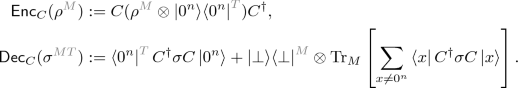 A special case of the Pauli filter for \(\mathcal {P}= \{(0^{\log |S|},0^{\log |S|})\}\) is due to Broadbent and Wainewright [BW16]. This choice of \(\mathcal {P}\) represents only identity: the operation \(\mathsf {PauliFilter}_{\mathcal {P}}^{} \) filters out any components of U that do not act as identity on S. We will denote this type of filter with the name \(\mathsf {IdFilter}^{} \).