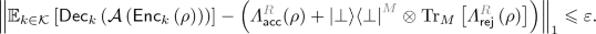 Finally, for a quantum operation that may take multiple rounds of inputs and outputs, for example an environment \(\mathcal {E}\) interacting with a protocol \(\varPi \), we write \(\mathcal {E}\leftrightarrows \varPi \) for the final output of \(\mathcal {E}\) after the entire interaction.