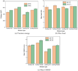 The paper evaluated the low temperature performance of the bituminous mixtures, which were produced in the plant using the dry process and compacted in the laboratory. ElastikoR crumb rubber was chosen to modify the bituminous mixture. Four types of bituminous mixtures, including leveling layer and surface layer gradation with and without crumb rubber, were produced in a plant in Iron Mountain, MI. The volumetric design of the mixture followed the Superpave mixture design. The leveling layer and surface layer mixture used 25 and 17% recycled asphalt pavement (RAP) (by weight of bituminous mixture). To improve the moisture resistance, dosages of 0.125 and 0.08% anti-stripping agent (by weight of bitumen) were selected for the leveling layer and surface layer. The low temperature cracking properties of four types of bituminous mixtures were evaluated using the Disk-shaped Compact Tension (DCT) test. The RAP content, bitumen content, and nominal maximum aggregate size (NMAS) influenced the low temperature cracking performance of the bituminous mixture. The fracture energy of the surface layer bituminous mixture was higher than that of the leveling layer bituminous mixture. The cracking resistance of the leveling layer and surface layer bituminous mixture were improved after the addition of rubber. The maximum CMOD was linearly correlated with the fracture energy of different types of bituminous mixtures.