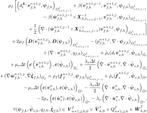 Solve the following linearized mixed finite element equation for \(\chi ^{n+1,j}\) with \(\chi ^{n+1,j-1}\) given at the \(j-1\) iteration: Find \(({\varvec{v}}_{f,h}^{n+1,j},{\hat{{\varvec{v}}}}_{s,h}^{n+1,j},p_{f,h}^{n+1,j},\hat{{\varvec{w}}}_{f,h}^{n+1,j})\in {\varvec{V}}^f_{n+1,j,h}\times {\hat{{\varvec{V}}}}^s_{h}\times Q^f_{n+1,j,h}\times \hat{{\varvec{W}}}^f_{h}\) such that