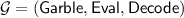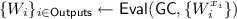 takes as input a garbled circuit \(\mathsf{GC}\) and input-wire labels \(\{W_i\}_{i \in \mathsf{Inputs}}\). It returns output-wire labels \(\{W_i\}_{i \in \mathsf{Outputs}}\). -