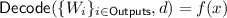 takes as input output-wire labels \(\{W_i\}_{i \in \mathsf{Outputs}}\) and decoding information d, and returns either \(\bot \) or a string