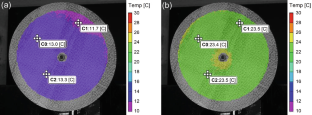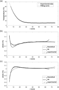 The finite element linear-elastic axisymmetric solution employed the software ANSYS® version 18.1 and used a Poisson’s coefficient μ = 0.36. Tests using different values of μ (from 0.32 to 0.38) showed to cause negligible influence in the numerical and analytic solutions. The applied boundary conditions consisted of zero radial stresses along the internal hole and external disc surfaces. The heating problem was treated as static. A thermal condition was applied to simulate the temperature distribution, obtained from the IR measurement, along the radius of the disc (from r = a to r = b). The model mesh consisted of 9535 SOLID186 elements and a total of 29,308 nodes.