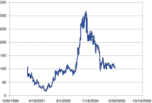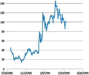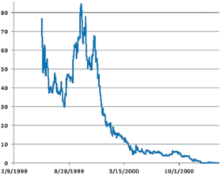 WRDS, Lastminute.com, bid prices, from 14 March 2000 to 30 July 2004; WRDS, eToys, bid prices, from 20 May 1999 to 26 February 2001; WRDS, Infospace, bid prices, from 15 December 1998 to 19 September 2002; WRDS, Geocities, bid prices, from 11 August 1998 to 28 May 1999