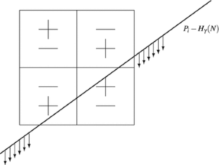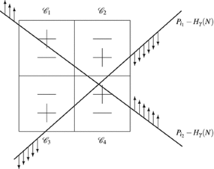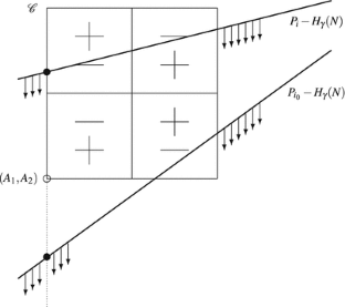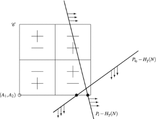 We do not distinguish between positive and negative slopes. Note that the reflected hyperbolic needle − H γ (N) has two long arcs: the upper arc, which is increasing, and the lower arc, which is decreasing; here the lower arc is below the upper arc. When we say that P i − H γ (N) intersects \(\mathcal{C}\), then it always means that at least one of the two long arcs of P i − H γ (N) intersects \(\mathcal{C}\). For example, in the trivial error discussed at the end of this paragraph, the intersection comes from the upper arc.