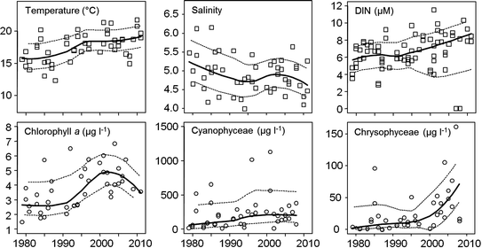 Trends in sea surface temperature, salinity, dissolved inorganic nitrogen (DIN), chlorophyll a, Cyanophyceae and Chrysophyceae in the Gulf of Finland, 1979–2008. Redrawn from Suikkanen et al. (2013)