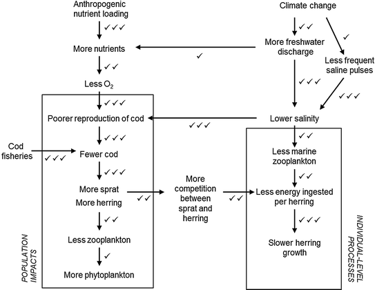 A schematic representation of the interactions between different trophic levels and some environmental factors in the pelagic ecosystem of the central Baltic Sea. Estimated confidence levels depicted as ✓ low confidence, ✓✓ medium confidence, ✓✓✓ high confidence (based on the judgement of the chapter authors)